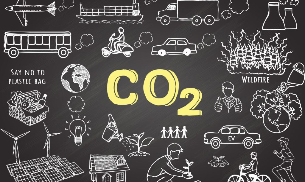 Causas del CO2 y alternativas para reducir el dióxido de carbono. Ilustración de Somjai King / Adobe Stock
