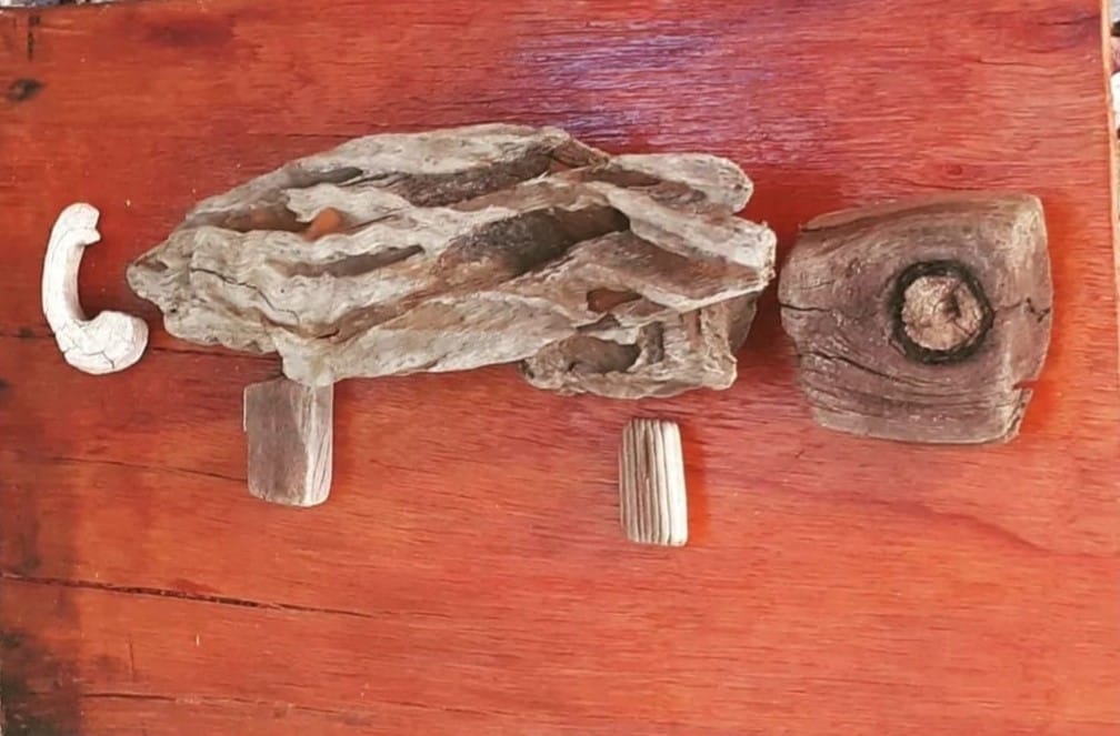-Ninguno, es ir caminando por la orilla y ver que se aparece y cuáles maderas llaman mi atención . Algunas podrán tener un diseño muy lindo, pero si el río entró mucho en ellas y tienen la madera en o por descomponerse no sirven para crear las obras.