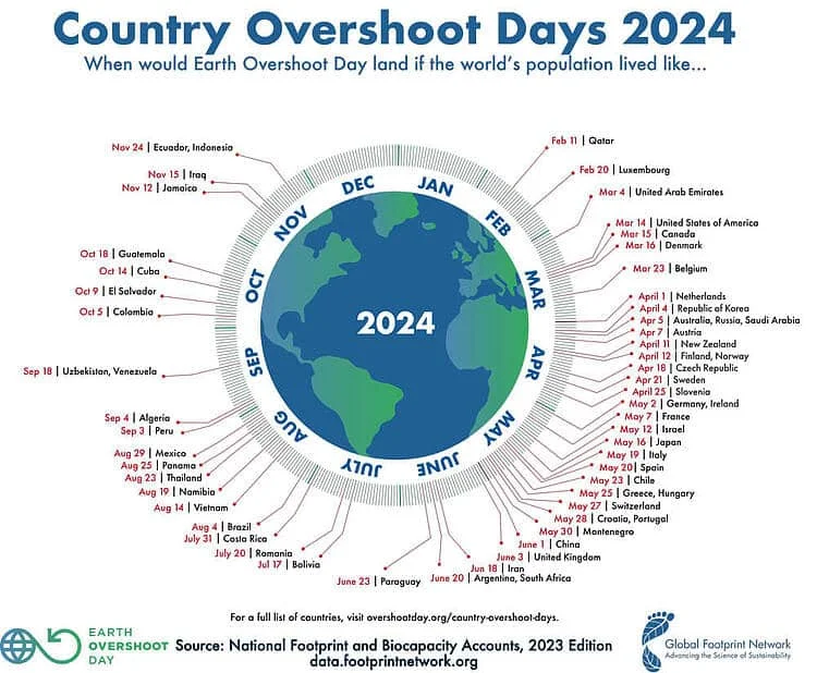 Global Footprint Network, mide la huella ecológica de los países para comparar la demanda de recursos de individuos, gobiernos y empresas con la capacidad de regeneración de la Tierra. Si bien el Día del Sobregiro es mundial, no todos los países consumen la misma cantidad de recursos al año. Por lo que, hay naciones como Estados Unidos que consumen hasta 5 veces los recursos del planeta en un solo año.