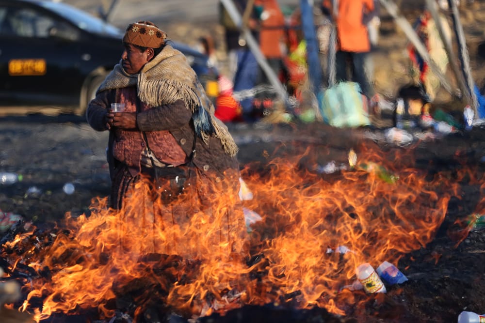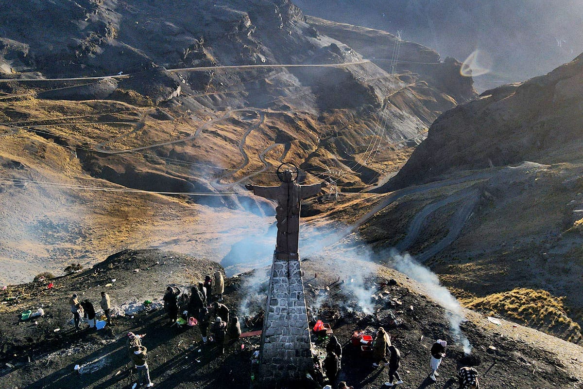 Las ofrendas no solo se limitan a las áreas urbanas, donde se realizan en viviendas y comercios; hay quienes prefieren llevar estas ceremonias a lugares considerados sagrados en la cultura andina, como La Cumbre. Este paso montañoso, ubicado a unos 4.200 metros de altitud, conecta a La Paz con la zona subtropical de Los Yungas. Desde la madrugada, personas de todas partes se dirigen a este sitio para iniciar el ritual, a veces incluso antes de que el sol, o tata Inti, comience su ascenso, recargando así sus energías.