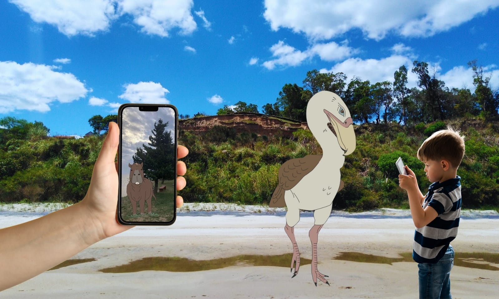 La pantalla del smartphone se transformará en una ventana al pasado. Aparecerán dos personajes creados para contar una historia, así como otros mamíferos de América del Sur que habitaron estas tierras hace tres o cuatro millones de años.