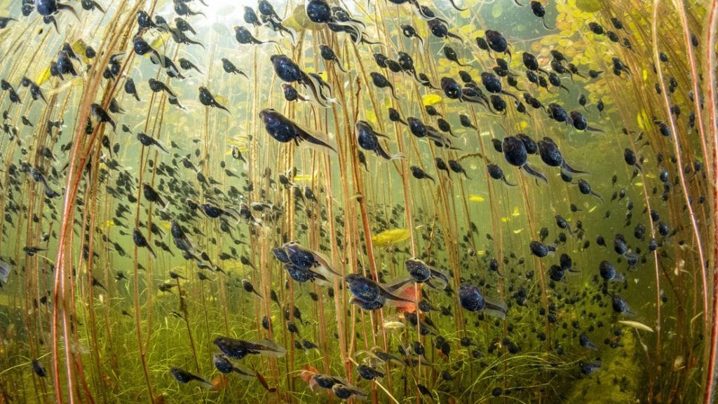 El fotoperiodista canadiense Shane Gross ha sido galardonado como Wildlife Photographer of the Year (Fotógrafo de Vida Silvestre del Año 2024) por su cautivadora imagen titulada «El enjambre de la vida». Esta fotografía retrata una manada de renacuajos de sapos occidentales de color negro y dorado, inmersos en un «etéreo mundo submarino» en Canadá, rodeados de algas.